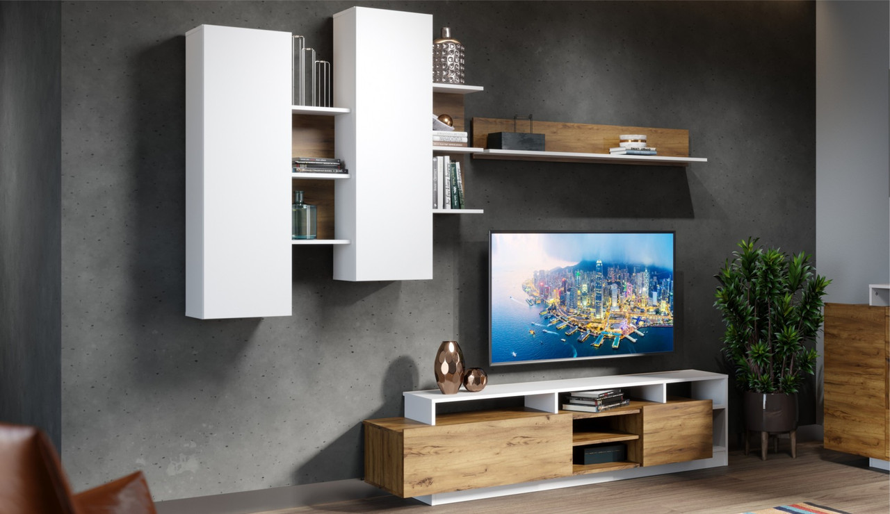 Стенка Невио-2 выполнена с использованием новейшего декора «Дуб крафт золотой» в сочетании с белым - подходит для стилистических направлений лофт, минимализм, скандинавский. Простые формы, естественные природные оттенки создают гармоничную и умиротворенную атмосферу гостиной. Четкая текстура дерева, белый цвет, отсутствие внешней фурнитуры, углубленный цоколь - создают визуальную легкость и компактность стенки. Фасады, выступающие на 1см поверх корпуса, заменяют ручки. В комплекте со стенкой идет комод с витриной, интерьер можно украсить декором, посудой.