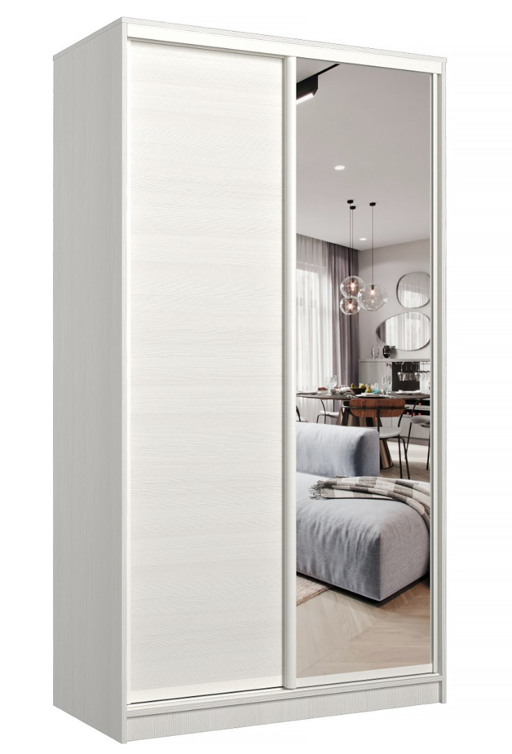 Стандартная глубина шкафа в 60 см позволяет разместить одежду на плечиках без помех для открытия раздвижных дверей, а полки создают вместительные ниши для крупных вещей, таких как постельное бельё, пледы, одеяла и подушки.